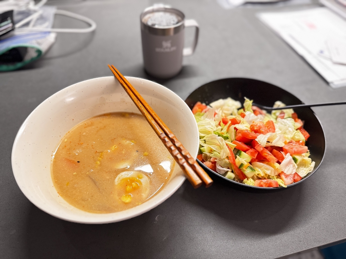 今日は残っていた野菜類を全て消費すべく、がっつりサラダ&味噌汁を食べました(冷凍ご飯が残ってなかったのでおかずのみ)。